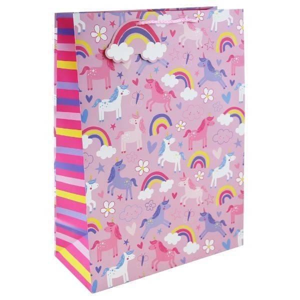Present your gifts beautifully using this XL unicorn and rainbow themed gift bag. This convenient packaging features bright, magical designs perfect for any special occasion or celebration. This value pack ensures you have multiple coordinating bags ready for immediate gifting needs.