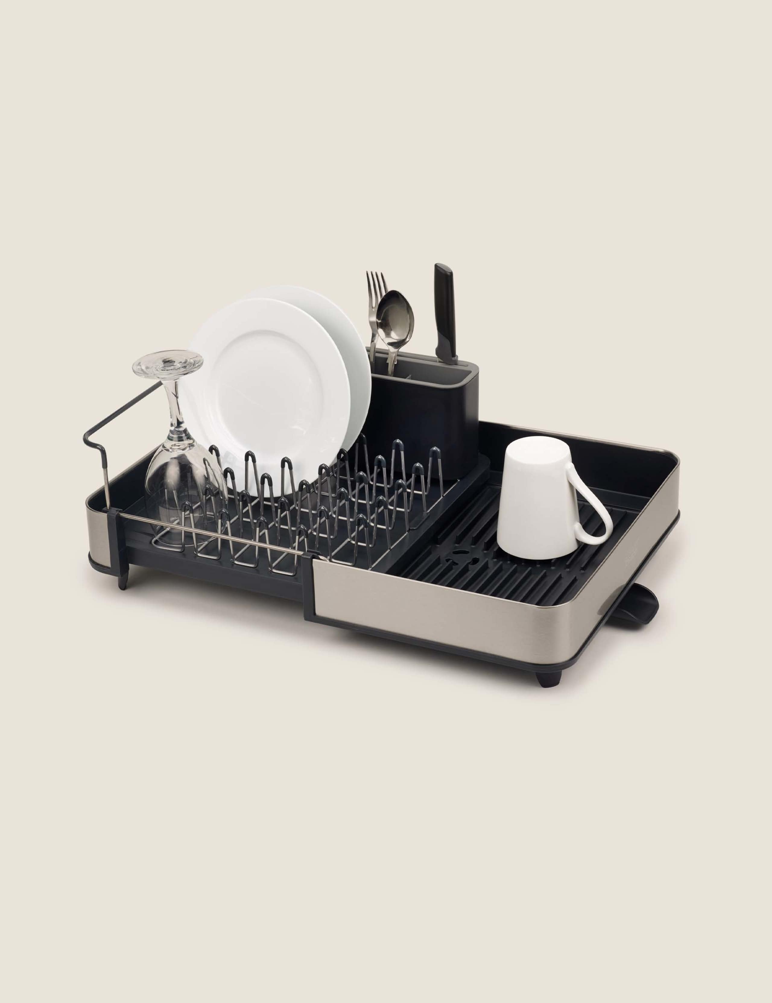 Read MoreMake the most of your sink space with this extendable stainless steel dish rack from Joseph Joseph. This clever two-part sliding tray is easily adjustable to fit the size of your draining area. A fingerprint-resistant coating ensures a clean and tidy look, plus non-scratch tips on the base protect your surfaces. It also features a moveable cutlery drainer and a handy spout in the base that allows water to drain directly into the sink.