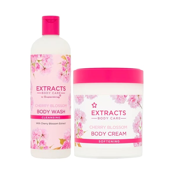 This body wash and cream bundle is enriched with sweet floral extracts for all day smoothness. Contains: Superdrug Extracts Cherry Blossom Body Cream 475ml Superdrug Extracts Cherry Blossom Body Wash 500ml