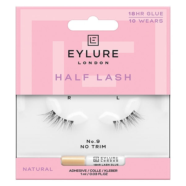 Half the Lash, Double the Wow Elevate your look effortlessly with our half lashes, designed to add just the right amount of volume and length for a natural yet striking finish. Perfectly sized, they require no trimming—just apply and go! Eylure No.9 is a sweet, wispy half lash that will add light volume to the outer corners of your eye. Reusable for up to 10 wears, every lash pack includes our latex-free lash glue, offering a secure hold that lasts up to 18 hours. Whether you're dressing up or keeping it casual, these half lashes deliver double the impact with half the effort. Get ready to wow, every time!