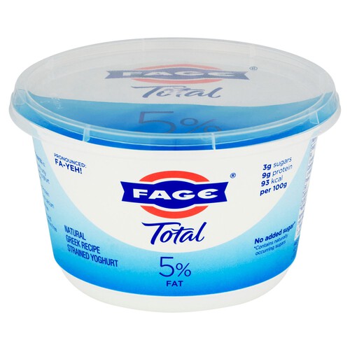 Fage Total 5% Fat Natural Greek Recipe Strained Yoghurt offers a thick, rich texture crafted using only milk and yoghurt cultures. This strained product is naturally high in protein and provides essential calcium for your diet. It maintains purity by being entirely free from added preservatives or artificial additives.
