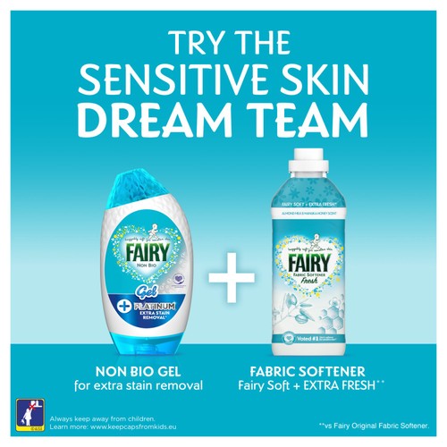 Read MoreDiscover Fairy Non Bio Platinum Washing Liquid with Extra Stain Removal. It's more powerful on stains (vs. Fairy Non Bio Liquid) and still so soft on sensitive skin. Power & care combined: Fairy Non Bio Platinum Liquid was specially formulated to deal with though stains even on a cold wash, whilst wrapping your family's delicate skin in huggable softness. Fairy Non Bio was voted No. 1 laundry brand for sensitive skin (online panel of 7413 adults) and awarded the Skin Health Alliance Seal. Fairy washing liquid is versatile, easy to use, and good for pre-treating heavily soiled clothes too. Just pop the right amount in a dosing cap and add that direct to the heart of your wash, so all those magical Fairy ingredients can get to work straight away. Try together with Fairy Fabric Conditioner and Fairy In-Wash Scent Booster for most huggable softness and mild freshness that last and last.