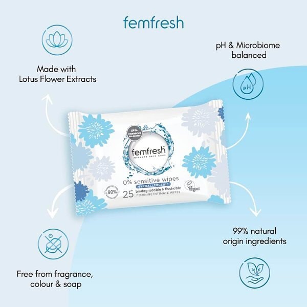 Read Morekeep your intimate skin clean refreshed and ph balanced with new femfresh 0 sensitive wipes the instantly refreshing feminine wipes are made with biodegradable and flushable substrate and feature 99 natural origin ingredients with lactic acid aloe vera and calendula extracts the fragrance free wet wipes are ultra gentle to sensitive skin their phbalanced formula is dermatologically and gynaecologically tested and they are hypoallergenic ideal for your delicate intimate skin these gentle yet effective biodegradable flushable and veganfriendly wipes wont irritate delicate skin like other scented wipes can and theyre gentle enough to use daily these wipes are kind to your skin and to the planet the discreet pack is perfect for on the go without easy access to water whether youre travelling working through a busy day or camping at a festival the soap and alcoholfree disposable cloths are also great for quick and easy cleaning when youre on your period to help you feel fresh and clean downstairs ideal for use on your vaginal and vulval areas femfresh is specially designed to help maintain a healthy natural ph balance to help reduce irritation and prevent itching and discomfort 25 lightweight instant wipes in a resealable pack leaving you with a feeling of longlasting freshness femfresh 0 sensitive feminine intimate wipes 1 x pack of 25 wipes gentle disposable unperfumed cloths gives you a showerfresh feeling without water eco safe biodegradable flushable vegan friendly with natural calendula aloe vera extracts ph balanced soap free suitable for everyday use hypoallergenic fragrance free dermatologically gynaecologically tested to use wipe intimate skin front to back as you would with toilet paper please note packaging may vary part of the femfresh range specifically designed to care for womens delicate vulval areas