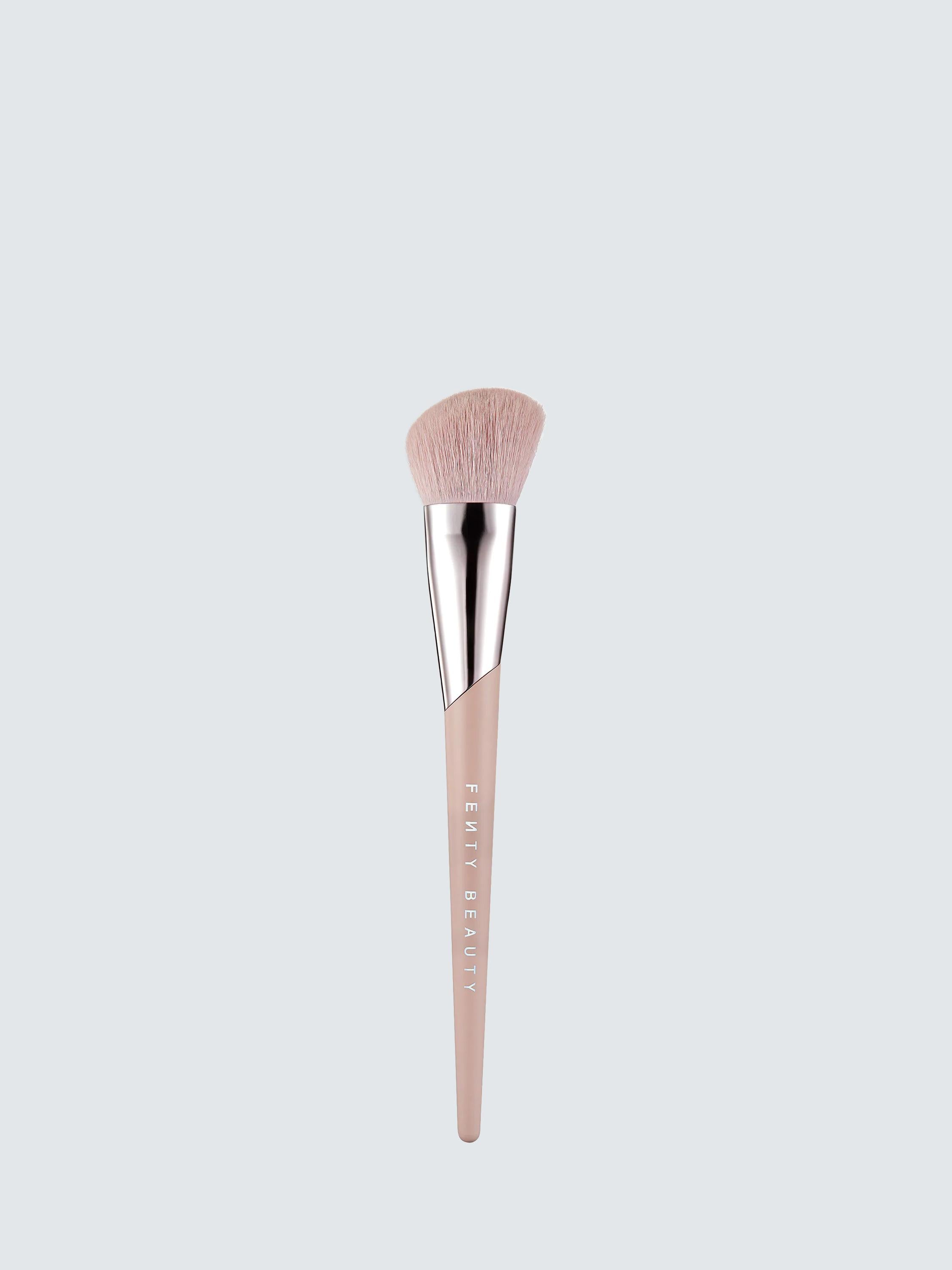 Fenty Beauty Face Shaping Brush 125 offers a plush, angled design for superior makeup application across the face. This expertly crafted tool ensures flawless blending of both cream and powder formulas seamlessly. It is perfectly shaped for precise soft sculpting, enhancing definition on the cheekbones and face contours easily.