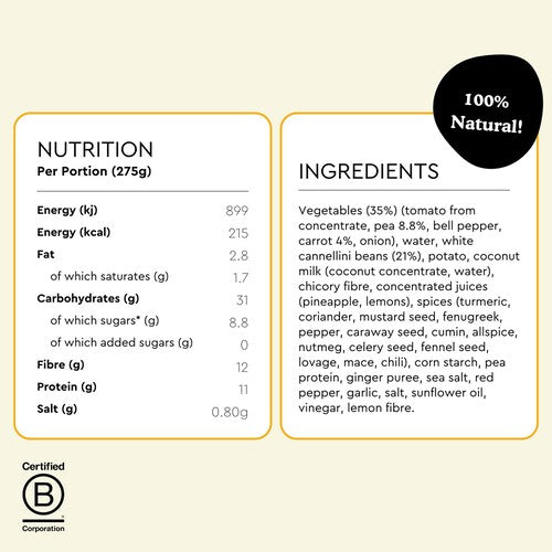 Vegetables (35%)(Tomato from Concentrate, Pea 8.8%, Bell Pepper, Carrot 4%, Onion), Water, White Cannellini Beans (21%), Potato, Coconut Milk (Coconut Concentrate, Water), Chicory Fibre, Concentrated Juices (Pineapple, Lemons), Spices (Turmeric, Coriander,