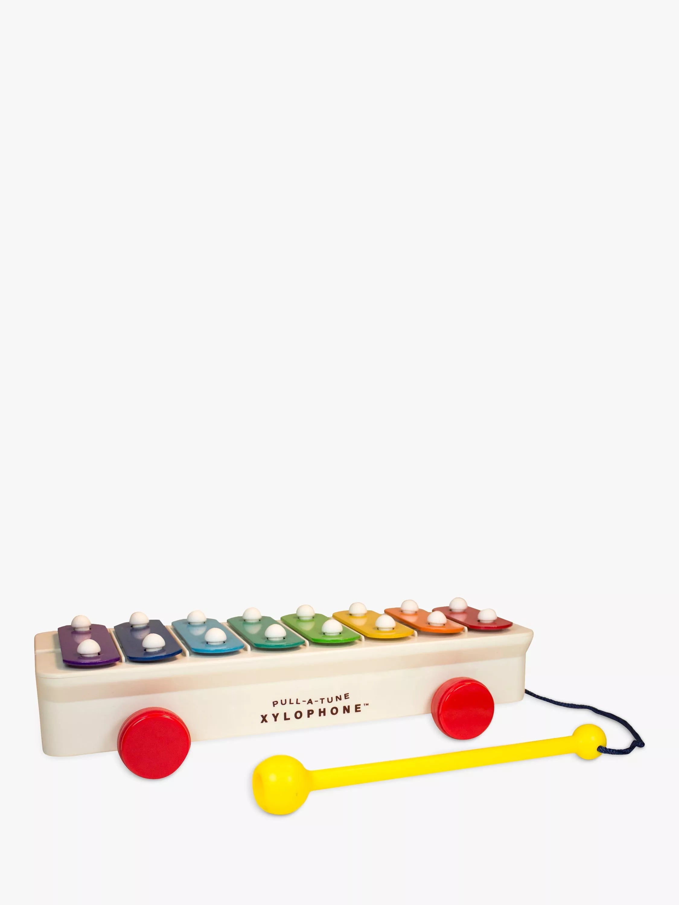 Tap the rainbow-coloured bars with the mallet to make beautiful music! The mallet is attached by a string so it never gets lost and it's on wheels, so kids can pull it along wherever they go!