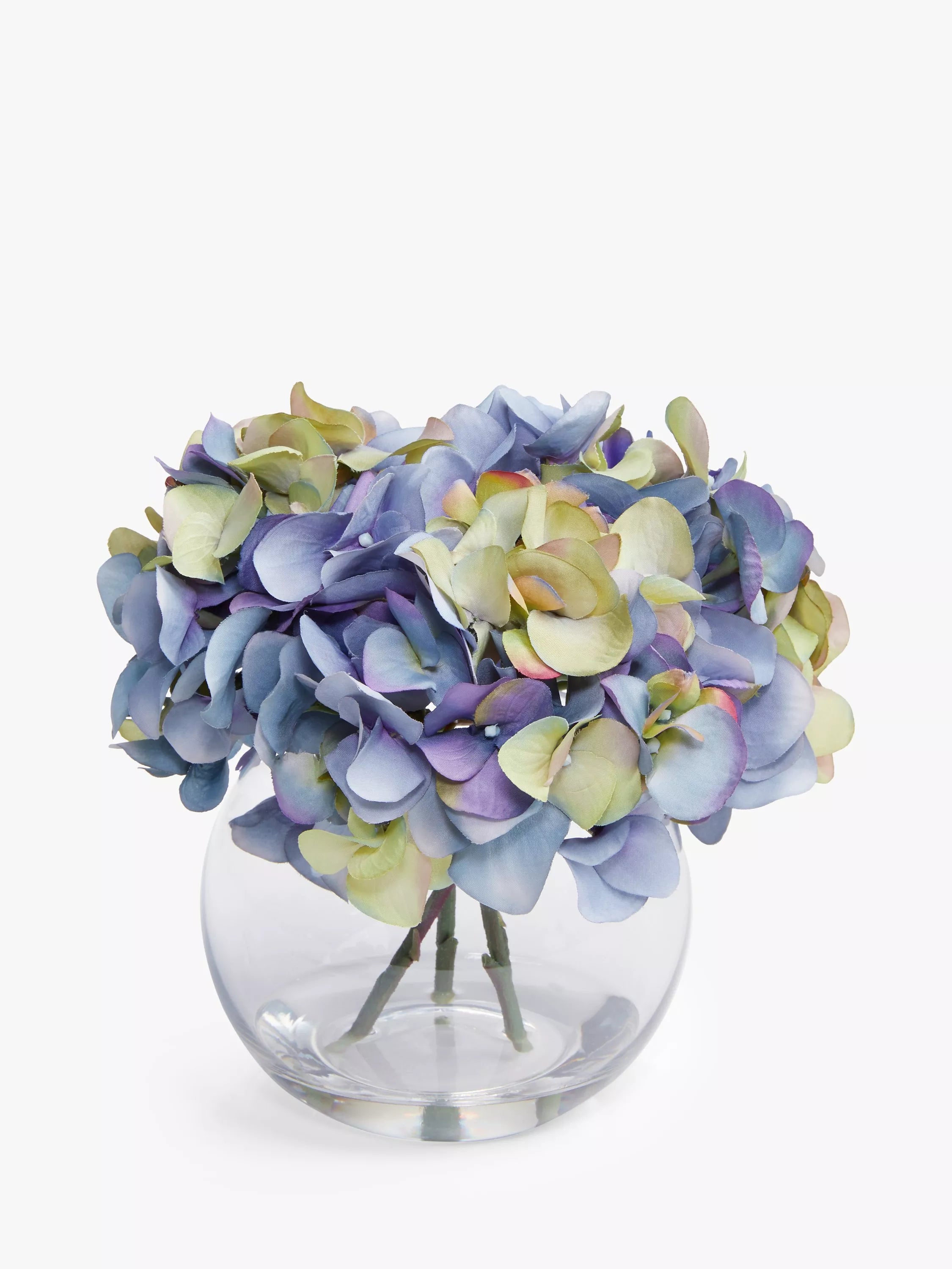 Delightfully realistic and in bloom all year round. Made in the UK by Floralsilk, artificial hydrangeas in a glass globe vase. The stems are set in clear resin creating a ready-made arrangement for any interior or making a lovely gift for someone special.