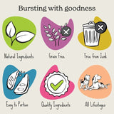 - Designed to help nourish the relationship between you and your four-legged friend in between mealtimes- Made using natural ingredients, bursting with goodness and packed full of flavour- Grain-free, making them the perfect treat for even the most sensitive of tummies- Free from junk & fillers- Soft-bite texture, which is more palatable- Lovingly hand-baked in wood-fired ovens by our team of expert bakers in the UK- Each heart shaped treat can be easily broken in two for smaller dogs, or just to make them last longer- For dogs aged 2 months+- Our treats pouches are recyclable at larger stores