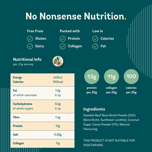 Freja Cacao offers a subtly sweet way to integrate bone broth benefits into your daily routine as a convenient shake. This powder is formulated using 100% natural ingredients, presenting a delicious source of both natural collagen and protein suitable for the entire family. It serves as a cleaner alternative to highly processed supplements currently on the market.