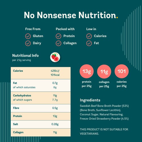 Read More11g Collagen* 13 g Protein* 101 Calories *per 25g serving A subtly sweet collagen and protein powder made with 100% natural ingredients Feel better with Freja Enjoy all the health benefits of bone broth in a subtly sweet shake that all the family can enjoy. Ditch your highly processed collagen supplements and additive-laden protein powders for this delicious source of natural collagen and protein.