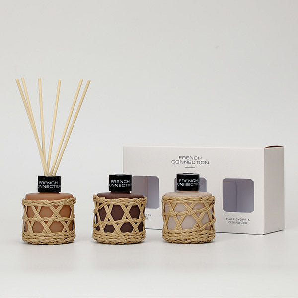 The Giftset includes three natural coloured ceramic diffusers with woven outer detail featuring three beautiful scents; Bergamot & Jasmine, Cedarwood & Citrus and Black Cherry & Cedarwood. 3 x 50ml