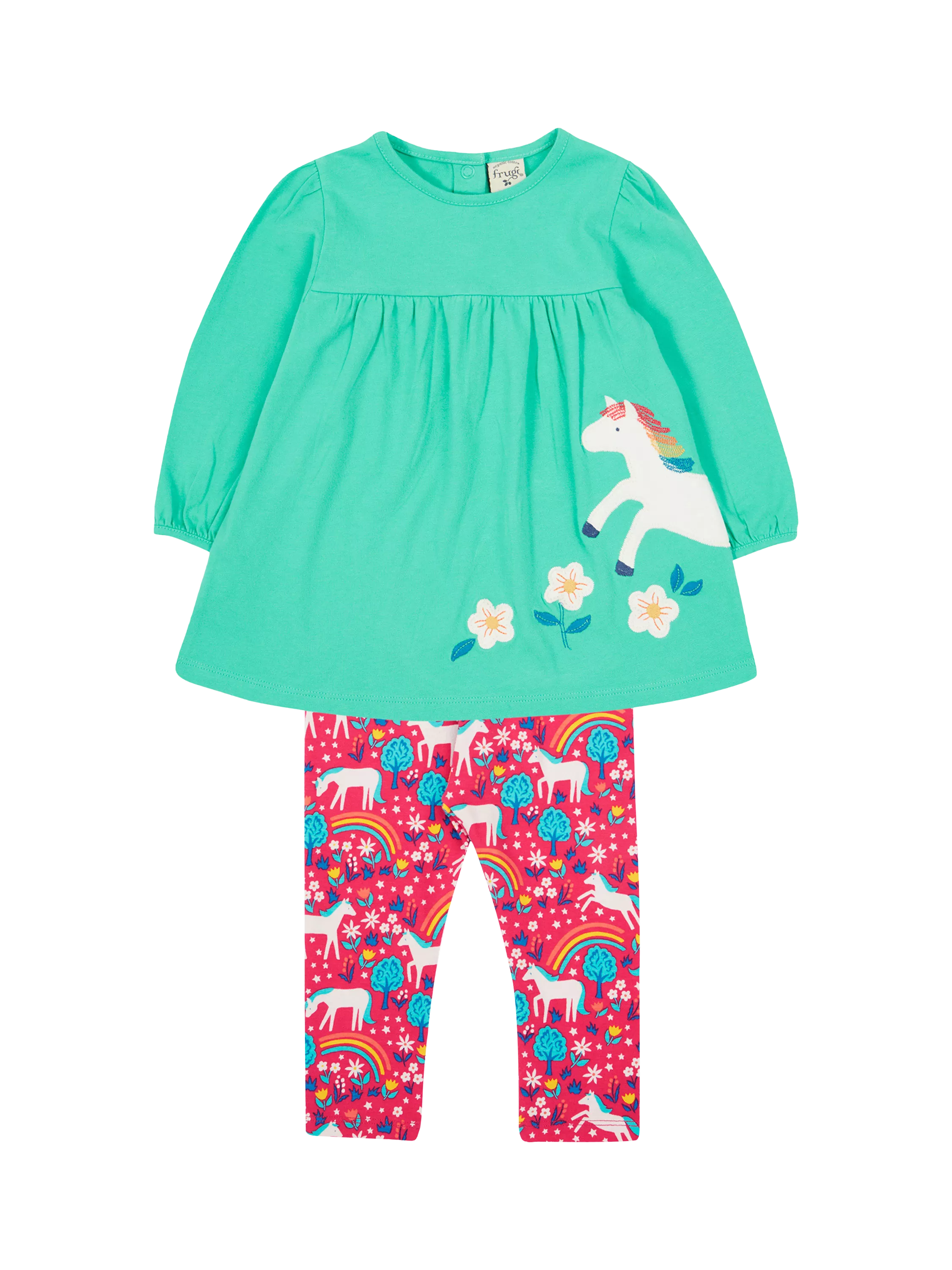 This 2 piece outfit set features a long-sleeved top and stretchy leggings. The top has soft gathers at the sleeve, head and chest. The sleeves have a soft balloon shape with gathered sleeve cuffs. Both are completed with unicorn-themed designs.