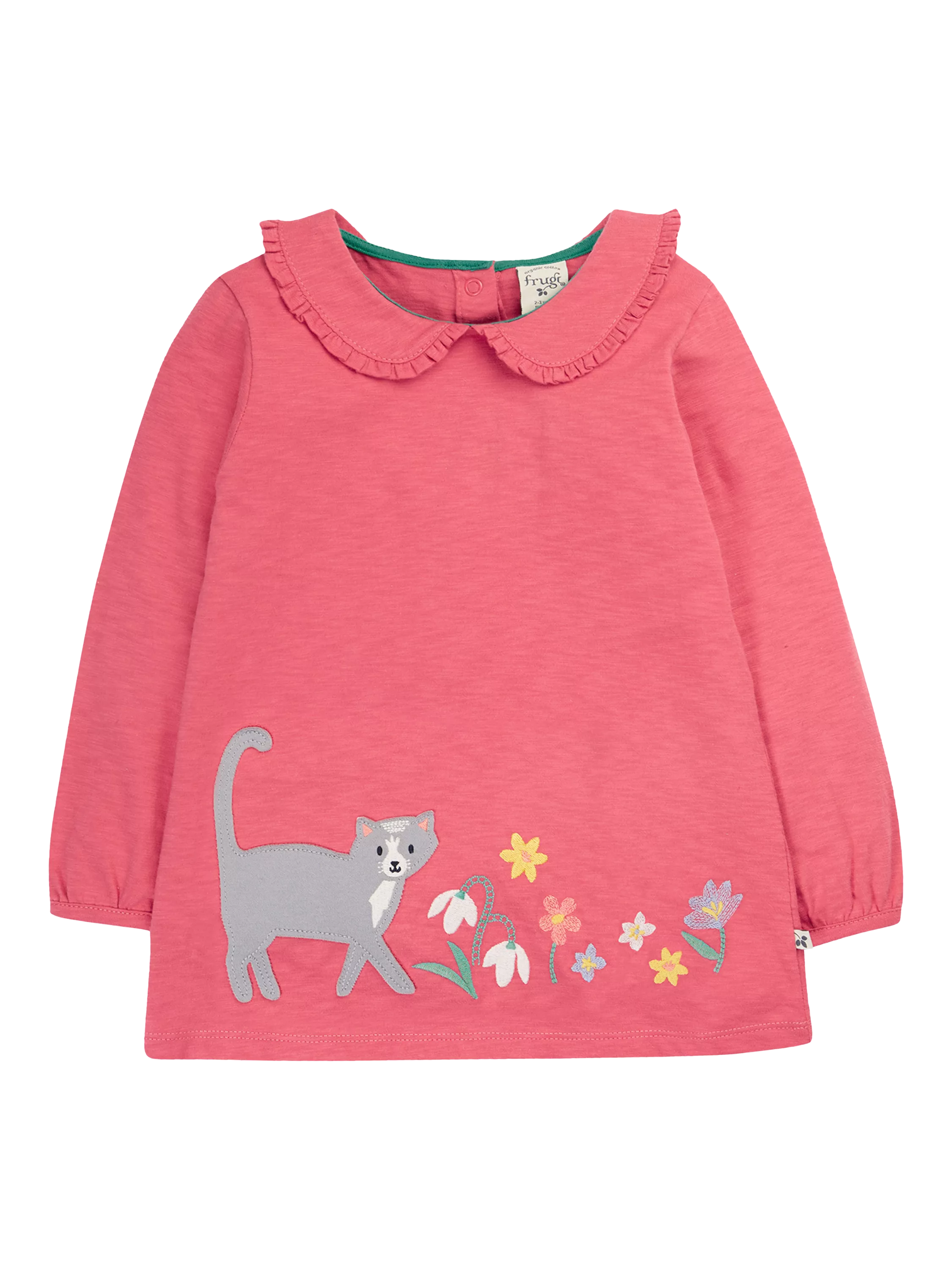 This long-sleeved organic cotton slub jersey top features an applique cat and floral design complemented by a Peterpan collar. Back popper opening allows for easy dressing.
