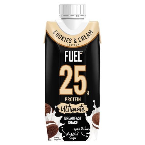 Read MoreRevolutionise your mornings with our delicious long-life UHT-treated FUEL10K Cookies & Cream Ultimate Breakfast Shake. This smooth drink combines skimmed milk, gluten free oats, and the indulgent taste of Cookies & Cream with a high-protein, vitamin-fortified formula, making it suitable for busy mornings! Perfect for an on-the-go breakfast or snack, this high protein drink is packed with 25g of protein! - to kickstart your day, without the added sugar.