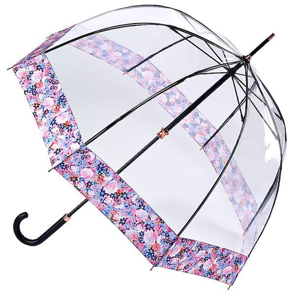 iconic dome shaped umbrella provides complete coverage of head and shoulders transparent high grade pvc cover for ease of vision when walking with a fabric printed border patented open and close mechanism for ease of use extra strong fibreglass frame with 8 ribs rib length 63cm and matching colour metallic tips and ferrule detail length closed 96cm span when open 88cm weight 480g approx