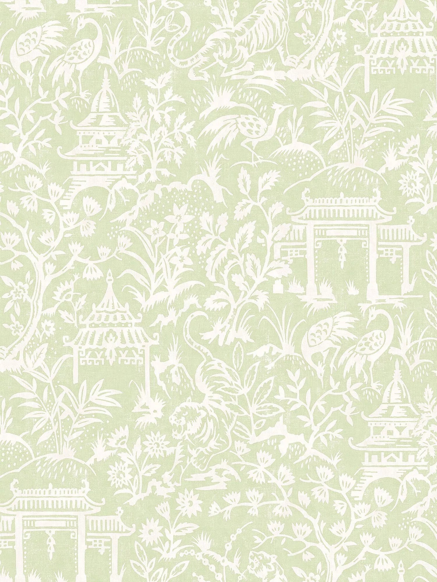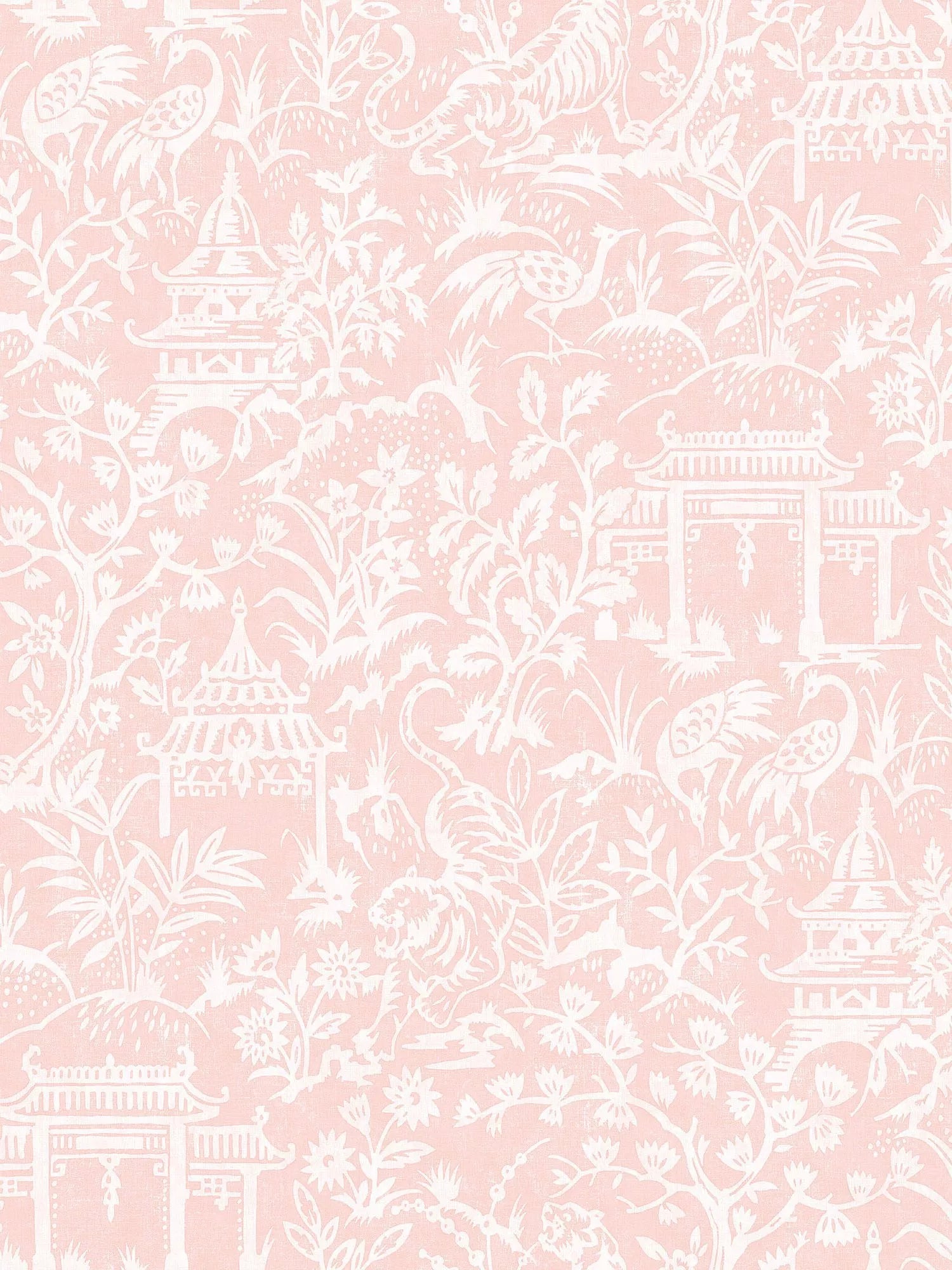 A fantastical wallpaper that reflects the 1970s fashion for exotic patterns and global cultures. Representative of a garden in the Far East, this oasis scene of floral sprigs, stylised trees, tigers and birds has been designed in a woodblock style effect to give it a time-worn look.