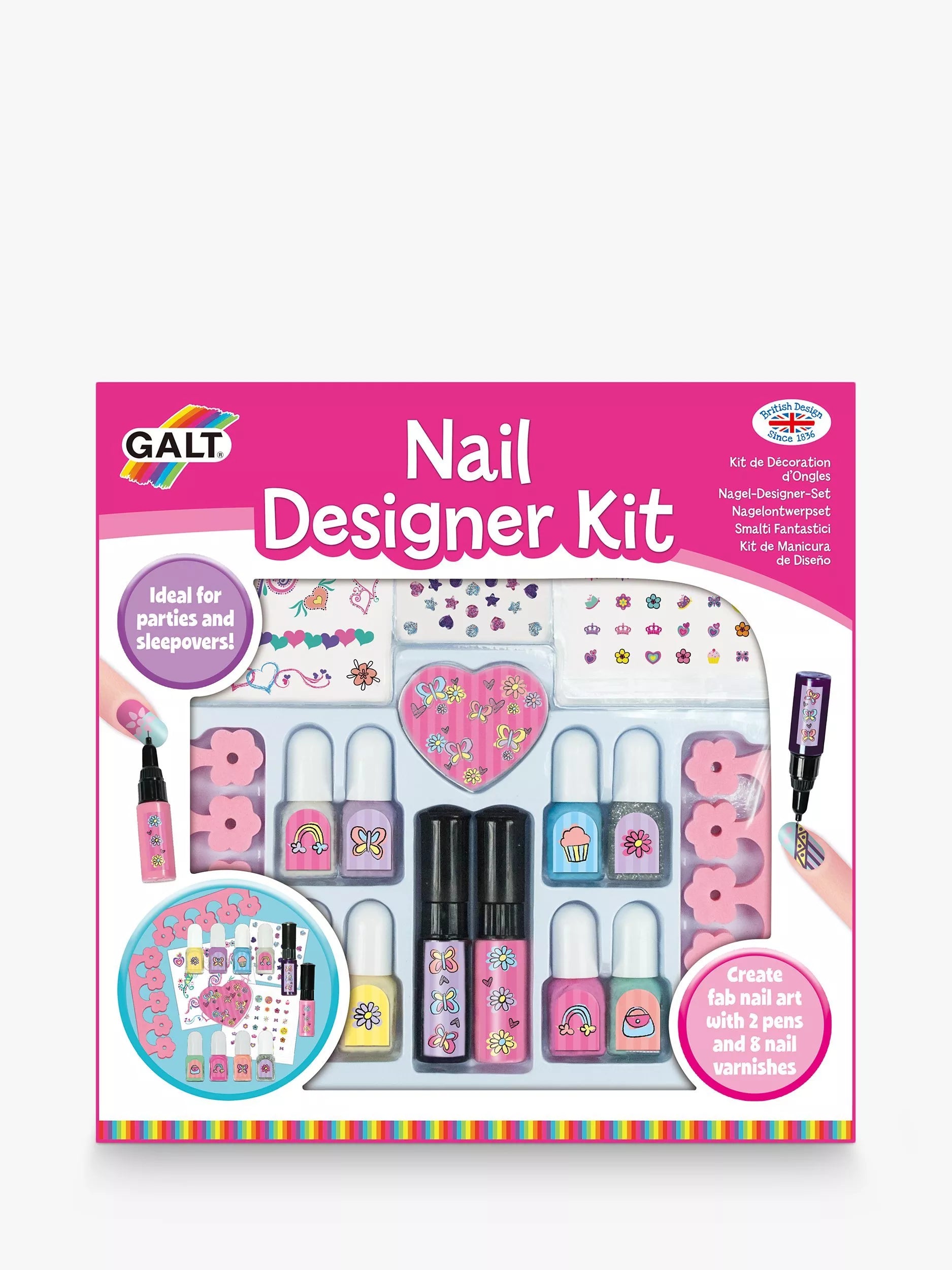 An exciting collection of seven colours to varnish your nails and two nail pens to create amazing designs. Decorate with nail stickers, glitter varnish and gems. Ideal for parties or sleepovers.