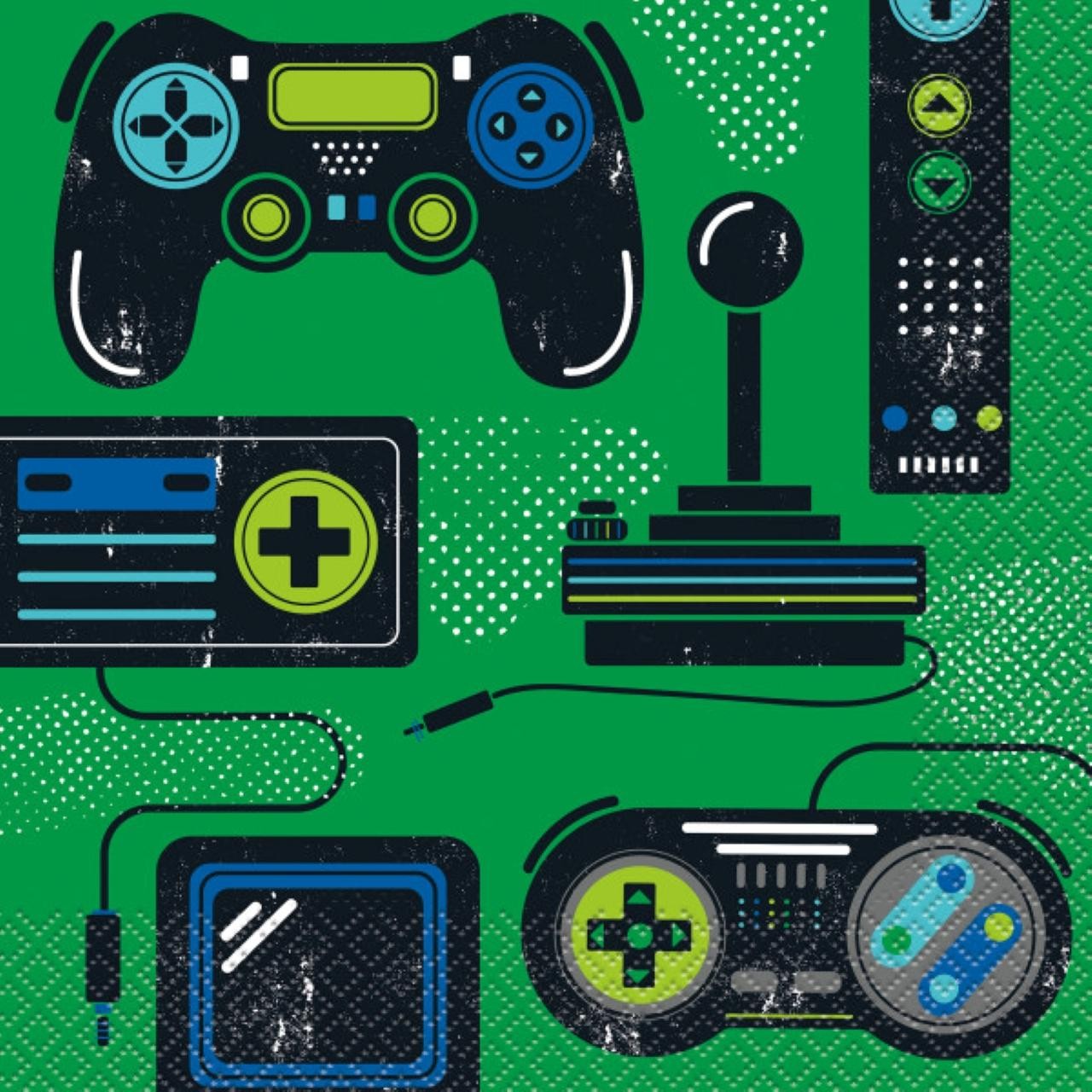 Prepare for celebrations with these 16 count paper napkins, ideal for any gaming-themed event. These 2ply napkins feature a colourful, nostalgic print of classic game controllers and joysticks set against a bright green background.