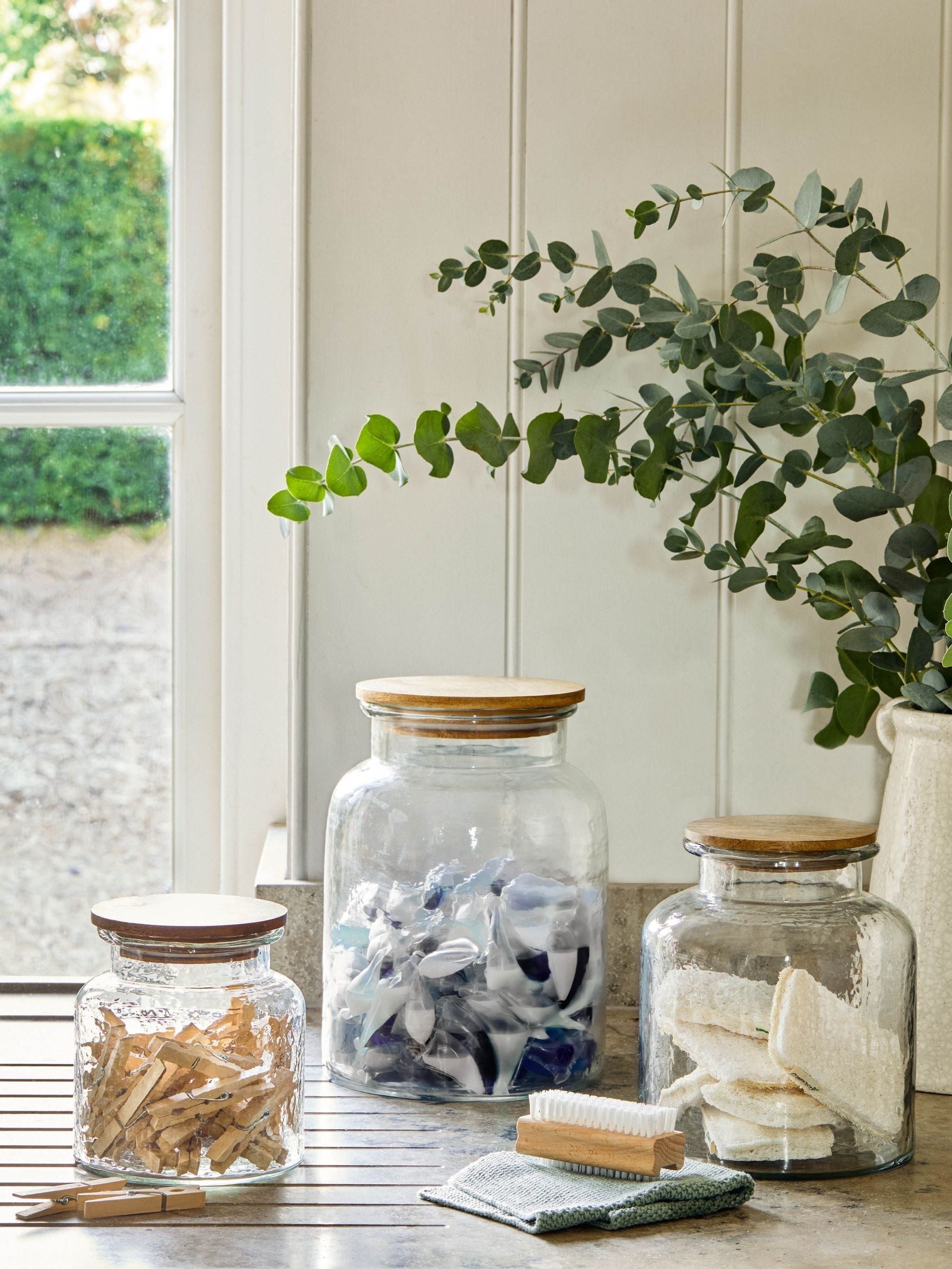 Upgrade your kitchen cupboards with the Hawling Storage Jar. This gorgeous jar is made from textured re-cycled glass with an airtight mango wood lids. Perfect for keeping pasta, rice, cereal and any other foods beautifully fresh. Alternatively, keep it full of pet food in the utility room, or use it for housing toiletries and accessories in the bathroom. Dimensions: H27 x W25 x D25cm. Wash the jar in warm soapy water, and wipe the lid with a damp cloth and dry thoroughly.