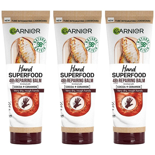 garnier hand superfood cocoa ceramide 75ml garnier hand superfood cocoa ceramide contains 98 of natural origin ingredients this repairing hand cream provides up to 48 hours of hydration effects remain after hand washing for very dry rough hands instrumental test 24 volunteers consumer test 50 subjects on skin suppleness softness after hand washing