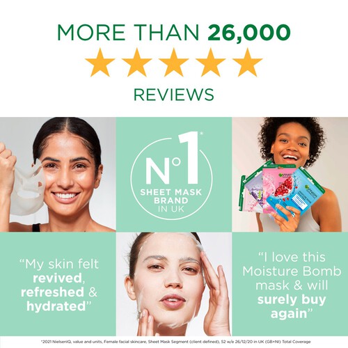 Experience intense skin refreshment with the Garnier Moisture Bomb Tissue Mask featuring Green Tea. In just 15 minutes, skin becomes intensely rehydrated and appears clearer and rebalanced after use. This treatment delivers the equivalent of one week's worth of hydrating serum in a single application.
