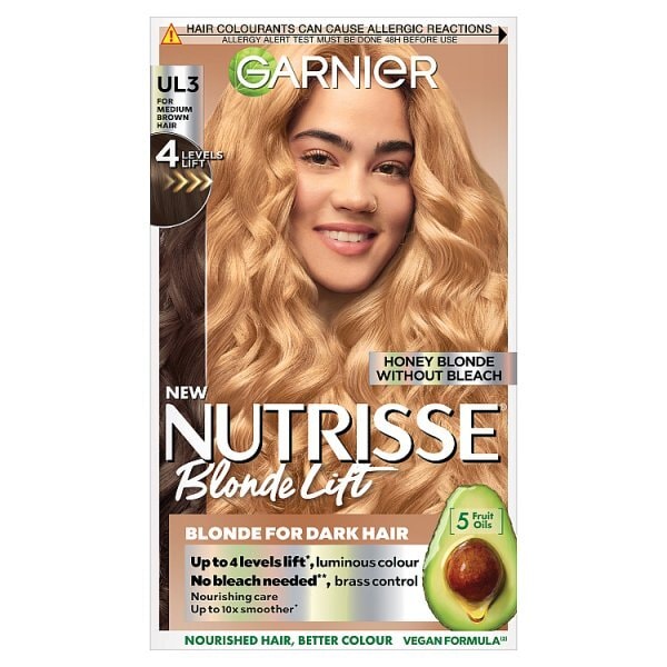 nutrisse blonde lift this is a vibrant permanent colour cream that delivers visible hair colour results even on dark hair it comes in a nourishing nondrip formula for easier application get shinier and more nourished hair in just one step high lift technology a new innovative technology that lifts hair colour up to 4 levels without using bleach specifically designed for natural untreated dark hair our new high lift technology allows for a luminous blonde shade without the need for bleach deep blue antibrass conditioner the conditioner contains ultra potent neutralising pigments to control warm undertones and control brass for a luminous blonde result up to 10x smoother hair while preserving hair strength 5 fruit oils avocado olive coconut argan and shea nourish your hair nourished hair means better and bolder colour suitable for all hair types textures and designed for natural dark hair vegan formula approved by crueltyfree international instrumental test after use of kit no bleach needed before use high repetition instrumental brushing test no animal derived ingredients or byproducts