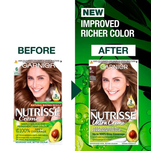 Read MoreWith Garnier Nutrisse Crème, nourished hair means better colour - all from the comfort of your own home. Our new colour boost technology infuses colour into the fibre for richer, radiant, and long-lasting colour with up to 100% grey coverage. Intensely nourish your hair with our new after colour conditioner. Enriched with 5 fruit oils, and silicone free for a natural feel, the conditioner restores the hair fibre, locks in colour and protects against dryness. Hair is left 5x stronger, 2x shinier and silkier.