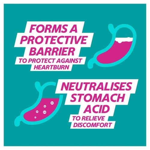 Each 10 ml of oral suspension contains 1000 mg sodium alginate and 200 mg potassium hydrogen carbonate as the active ingredients. The other ingredients are calcium carbonate, carbomer, methyl (E218) and propyl (E216) parahydroxybenzoates, benzyl alcohol (present in fennel flavour), sodium saccharin, sodium hydroxide, aniseed flavour derived from fennel and purified water. This product does not contain sugar or gluten. This medicine is available in bottles of 80ml, 100ml, 125ml, 140ml, 150ml, 180ml, 200ml, 250ml and 300ml.