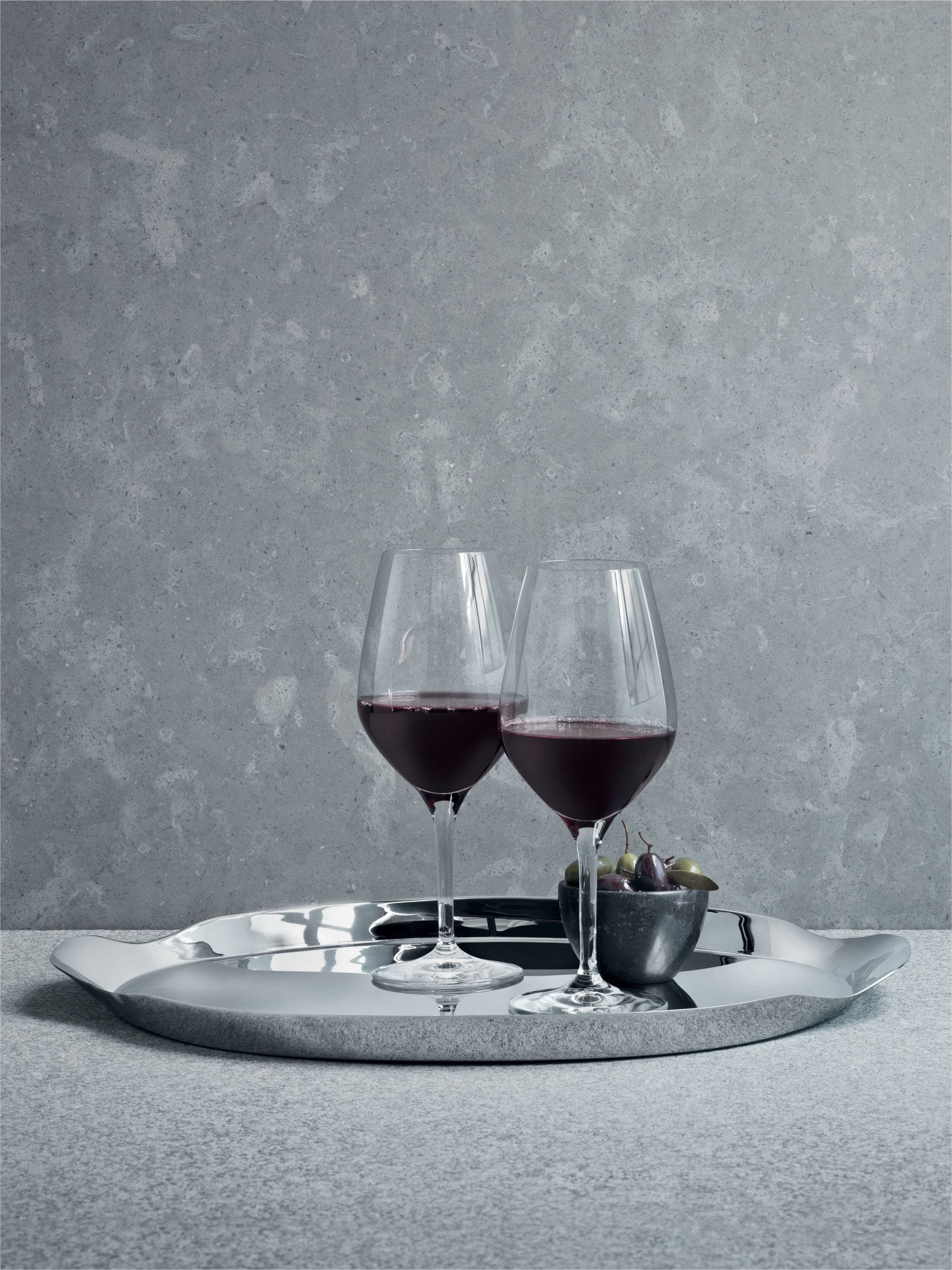 The wine tray is made from stainless steel with a high-shine mirror-polish finish that reflects the glasses and dishes beautifully.