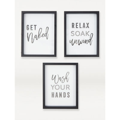 Read MoreLiven-up your bathroom walls with this trio of slogan framed prints from George Home. Each printed with playful wording, they’ve been slotted into a sleek black frame that’s easy to coordinate with. Team them together or scatter them around your suite. • 3-pack • Slogan prints • H 21.7cm x W 16.7cm