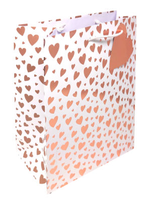 Great for any occasion, this delightful, fun Heart Rose Gold gift bag is the perfect way to make your present memorable. • Large gift bag with white ribbon handles • Rose Gold heart shape gift tag