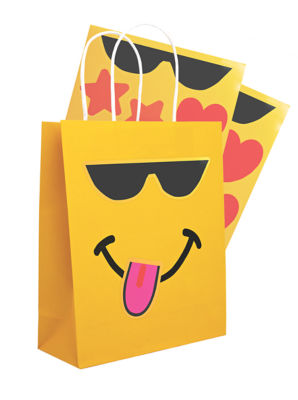 8pk Create your own smily face design using the fun and colourful stickers. Measurements: 180 x 220 x 70 mm White paper handles.