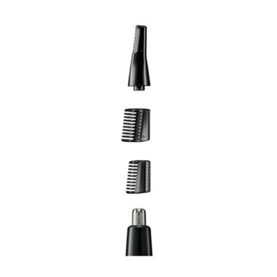 Battery operated requires 1 x AA battery not included. Includes comb attachment, eyebrow trimmer, Nose & Ear Trimmer and cleaning brush.