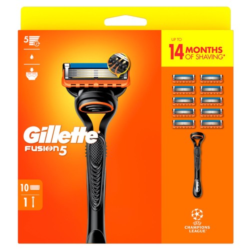 This Gillette Fusion set delivers a close and smooth shave, coming complete with a manual razor handle and ten blade refills. The construction includes an ergonomically designed handle providing reliable handling during use. This package offers excellent value for maintaining your grooming routine.
