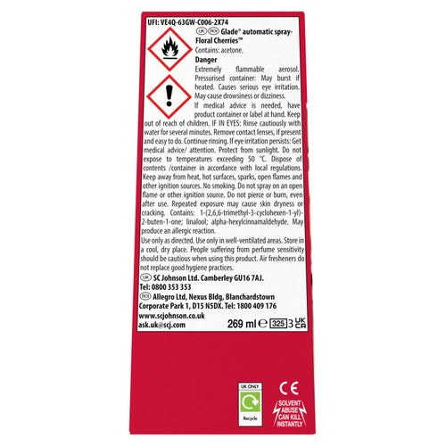 Enjoy up to 2 months of Glade fragrance*, Enjoy a fresh burst every 9, 18 or 36 minutes, Compatible with Air Wick® Freshmatic® devices**;, Frosted Floral Cherries with notes of juicy cherries, frosted flowers and ruffled peony, Fragrance crafted by master perfumers and infused with essential oils and made without phthalates, parabens, formaldehydes, *When used with the 36-minute interval; **Air Wick® and Freshmatic® are registered trademark of Reckitt Benckiser LLC; Neither this product nor S;C; Johnson & Son, Inc; are affiliated with or sponsored by Reckitt Benckiser LLC
