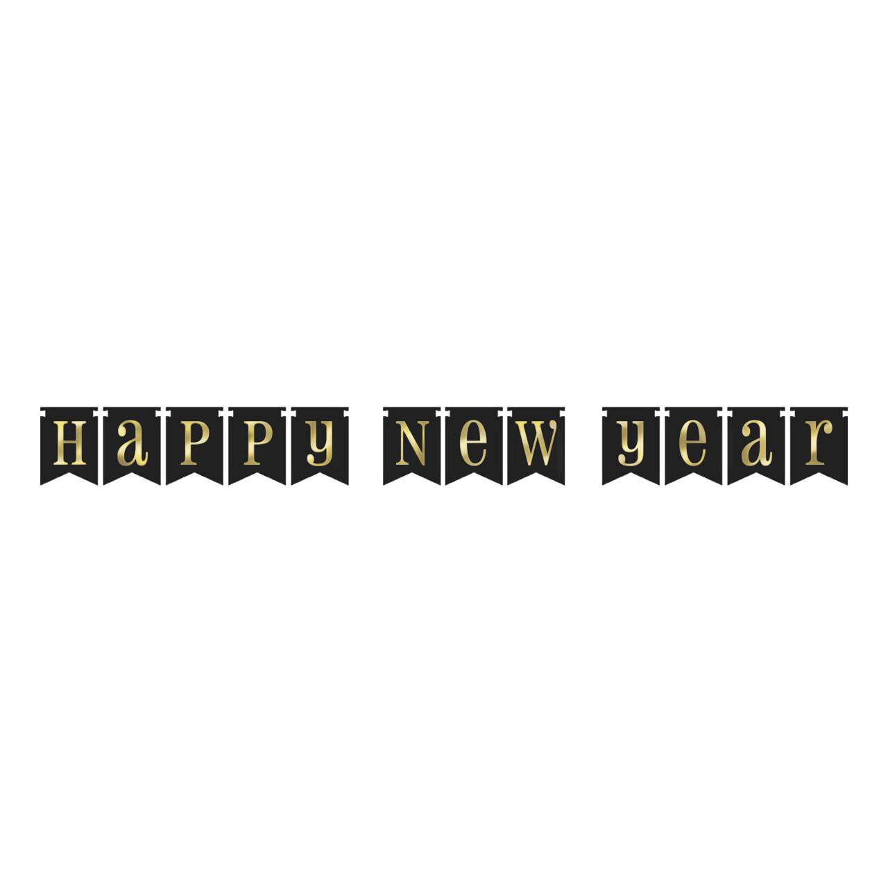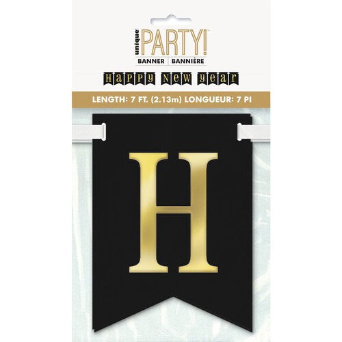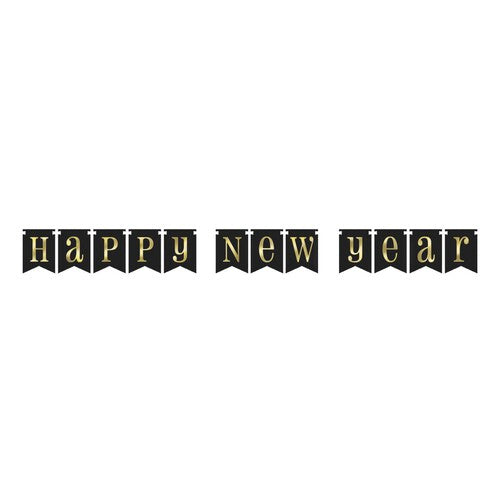 Prepare for your midnight celebrations with this stylish Black and Gold Happy New Year Pennant Banner. This decorative piece features elegant foil gold lettering spelling out the celebratory message. It is designed to enhance the atmosphere of any festive gathering.