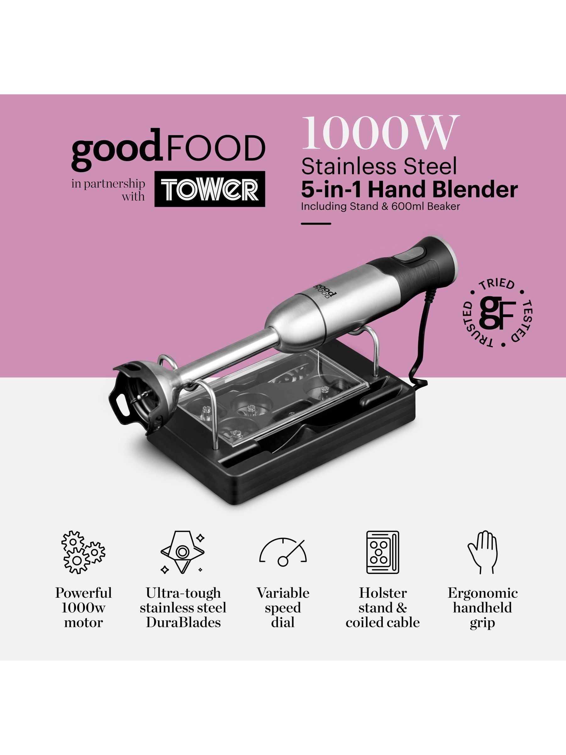This powerful Digital Hand Blender from Good Food by Tower is perfect for creating delicious soups, smooth batters and thick sauces for the whole family to enjoy. Complete with 5 interchangeable blades, the multi-functional design helps to bring versatility to mealtimes. The 1000W DC motor is powerful enough to help blend mixtures with ease, whilst stainless steel blades effortlessly slice through ingredients seamless and efficient use. Choose from milk frother, meat mincer, whisker, multi-blade and beater attachments, whilst the variable speed dial will let you control the speed settings with one hand so you can save time in the kitchen. It comes with a 600ml beaker so mixtures can be served and stored for later, along with an accessory holder for simple and convenient storage. The ergonomic grip ensures the blender sits comfortably in your hand, offering comfort and manoeuvrability when in use, whilst there is greater freedom of movement with a curly cord that prevents you from getting tangled.
