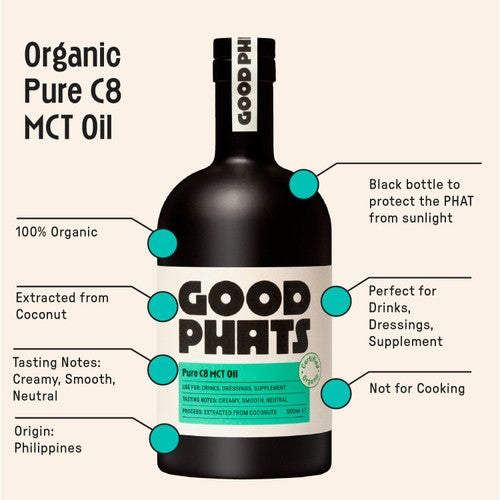 Our Organic C8 MCT Oil provides the perfect energy boost to kick-start your day., Derived 100% from coconut, this supplement-rich oil quickly converts into ketones, offering fast and sustained energy, improved mental clarity, and enhanced cognitive function., This PHAT is super neutral and light, with a creamy hint of coconut., GOOD PHATS Organic C8 MCT Oil is perfect for stirring into your morning coffee, mixing into your favourite dressing, or taking as a shot for your daily boost.