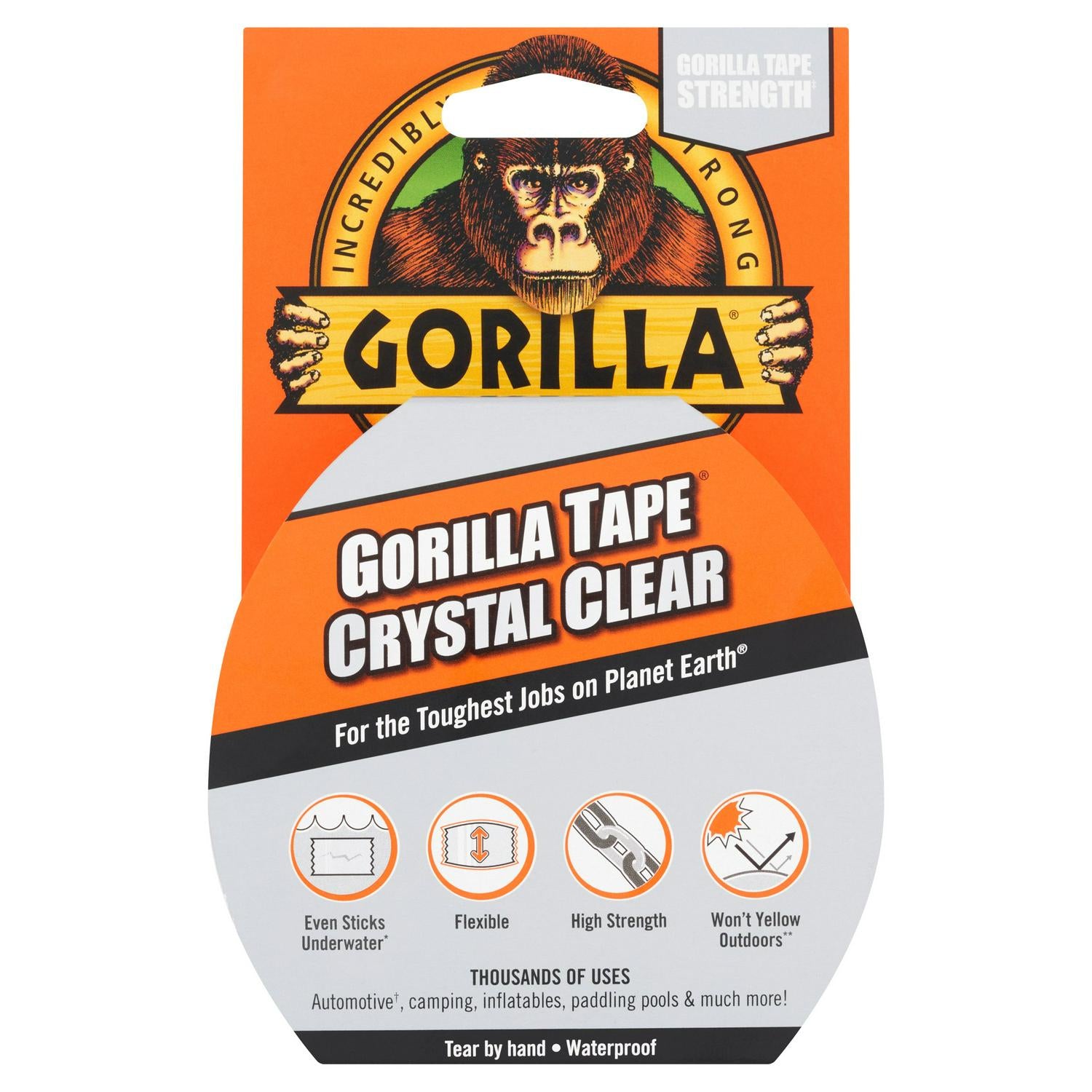 Read MoreGorilla Clear Repair Tape is our most discreet tape yet. But don't be fooled by appearances. It may look subtle, but this tape has serious strength.It works on all kinds of surfaces, inside or outside. From patching-up tents and protecting smartphones, to even working underwater on torn paddling pools.It provides a crystal clear, waterproof, airtight bond and is gauranteed not to split.Fix, patch, seal, hold & protect.