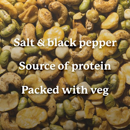 • Includes salted peas, broad beans, black pepper cashews, and edamame beans.