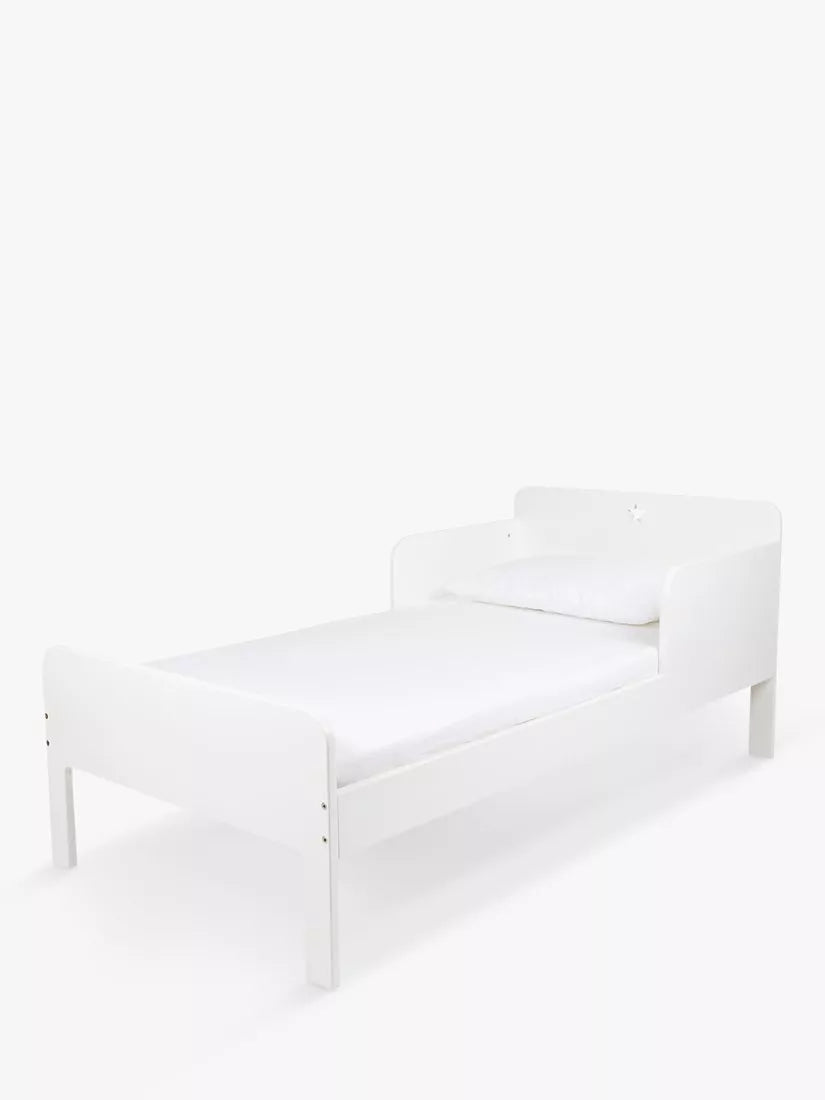 Part of the Star Bright range from Great Little Trading Co, this beautifully designed toddler bed framehas a sturdy MDF frame and slatted MDF base and is completed with a painted finish. The integrated headboard features a cute star cut-out, and its curved edges create a softer design focus. It's been designed to sit low to floor and has guard rails to help your child feel safe and snug in their first 'big bed'. This bed frame is supplied flat pack for easy assembly.