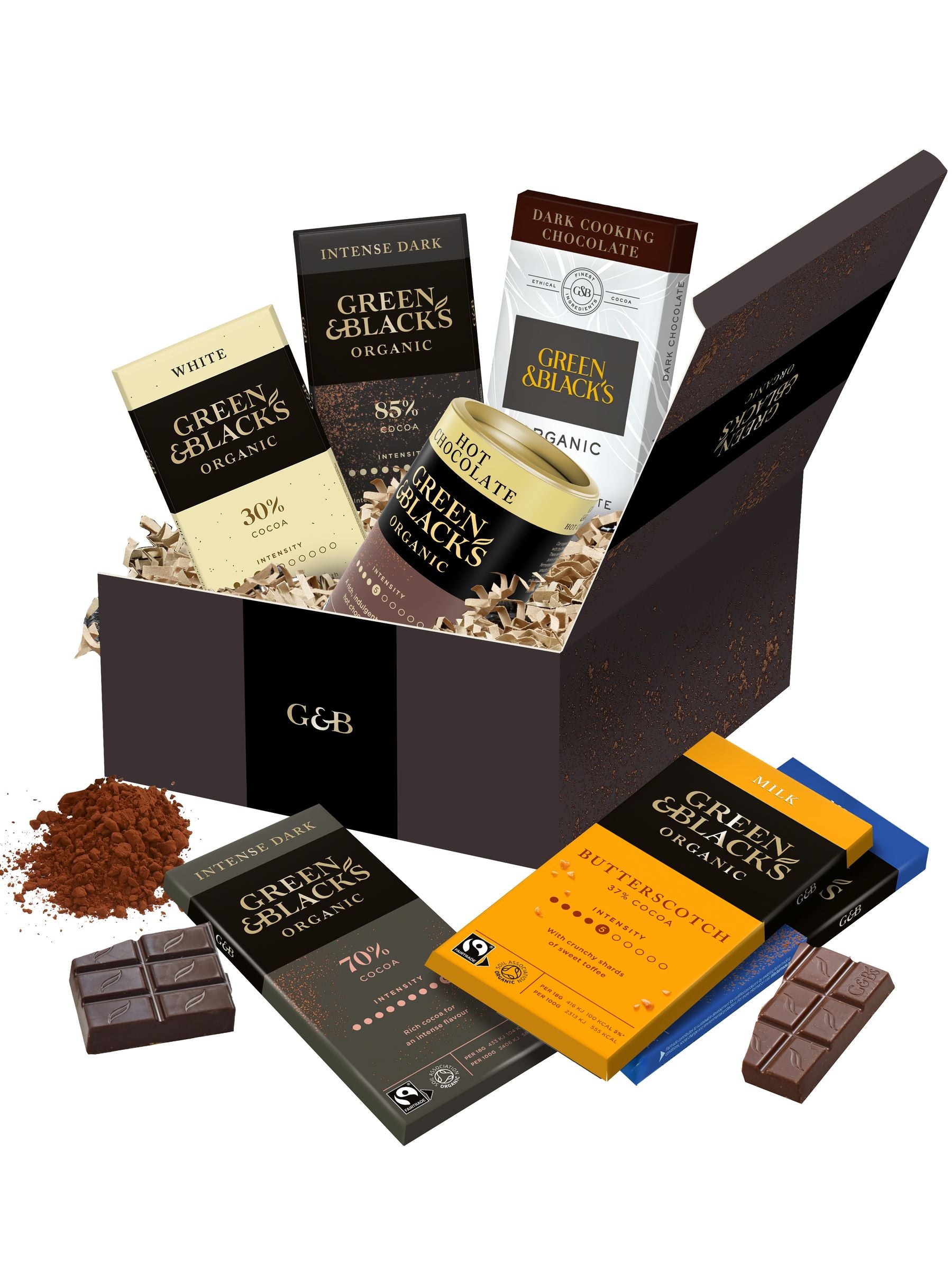 Green blacks hot chocolate gift box contains 1 x green blacks hot chocolate 300g 1 x green blacks cocoa 125g 1 x green blacks fairtrade dark 70 cooks chocolate 150g 1 x green blacks milk chocolate butterscotch bar 90g 1 x green blacks dark chocolate ginger 90g bar 1 x green blacks dark 85 chocolate bar 90g 1 x green blacks milk chocolate 90g bar and 1 x green blacks white chocolate bar 90g. (ref: q96166).