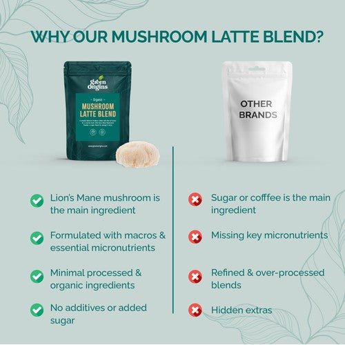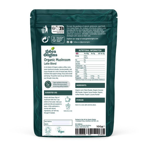 This Green Origins blend creates a mocha-style latte for daily consumption. It features Organic Lion’s Mane as the core component, balanced with Arabica Coffee, Cacao, and natural Lucuma sweetness.
