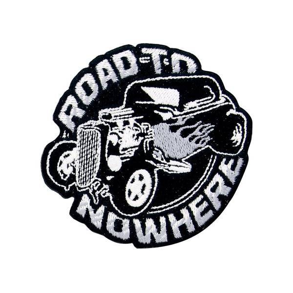 This embroidered patch showcases a detailed hot rod design surrounded by vibrant flames against a monochrome background. The central feature is the bold "ROAD TO NOWHERE" text integrated into the circular pattern. This accessory allows for easy customisation of jackets, bags, or other fabric items for a distinct look.