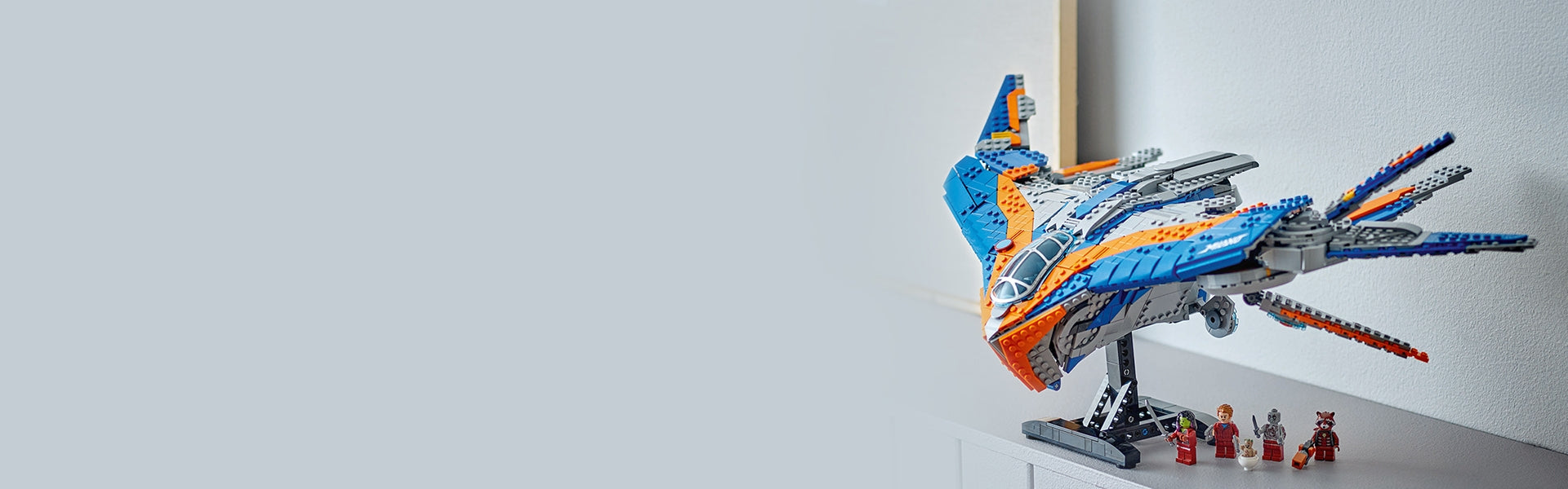 Based on the starship from the first Guardians of the Galaxy movie, this buildable toy features 6 adjustable wings and 4 moveable rear boosters. The top of the spaceship model lifts off to reveal a detailed interior with 3 distinct areas: a flight deck with room for 3 minifigures, a communal area with an additional seat and storage space for weapons, and a rest area with a bed and a tape deck (a key element in the movies). There are Star-Lord, Gamora, Drax and Rocket minifigures, plus a Baby Groot figure. A stand allows the spaceship to be displayed. The LEGO Builder app lets kids zoom in and rotate models in 3D using their digital device.