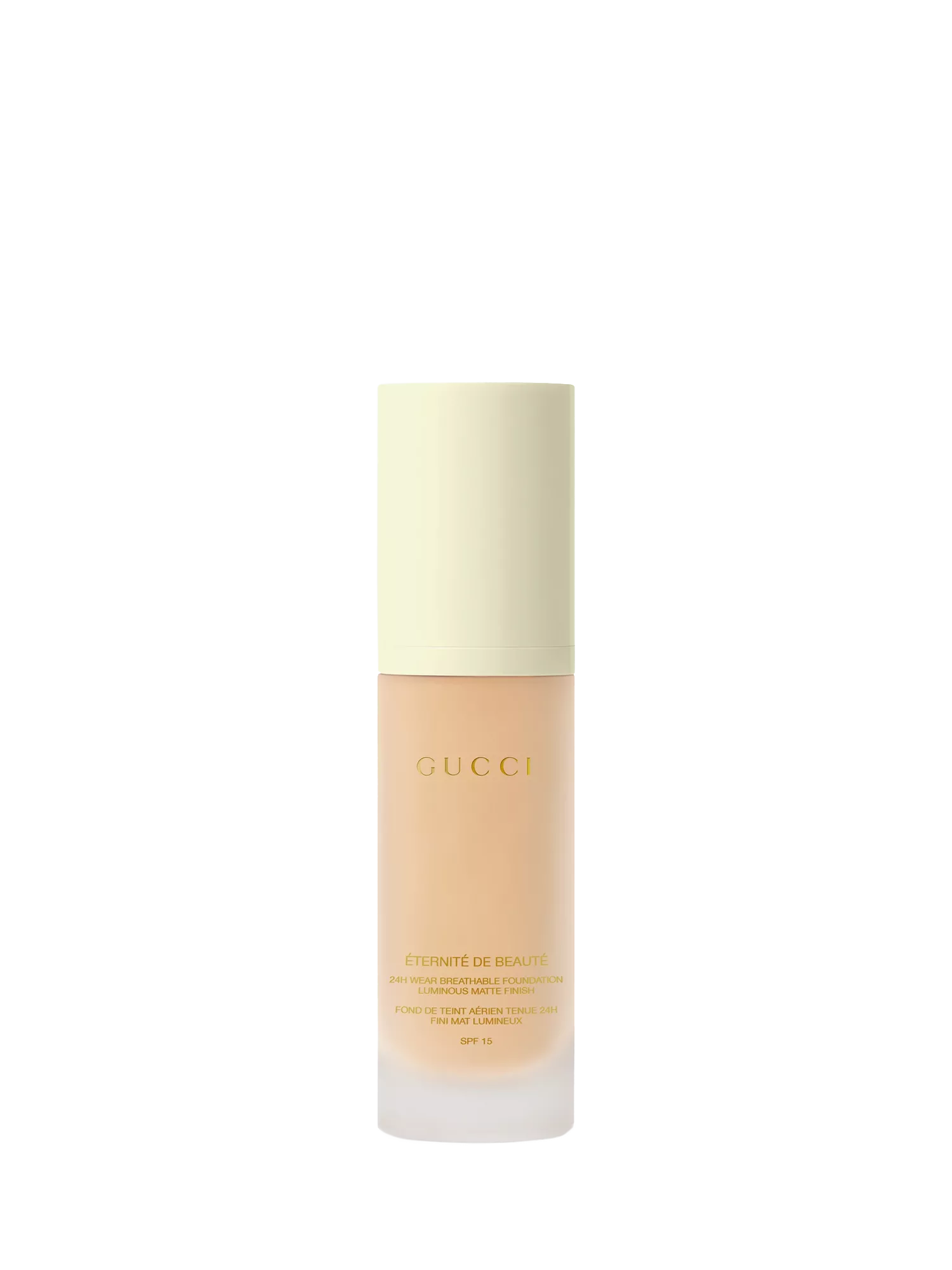 Gucci Éternité De Beauté foundation stays on the whole day, no matter how you play. This 24H, long-lasting Gucci foundation delivers a luminous-matte finish and full coverage in one drop, while feeling breathable, weightless, and comfortable. Available in 40 shades.