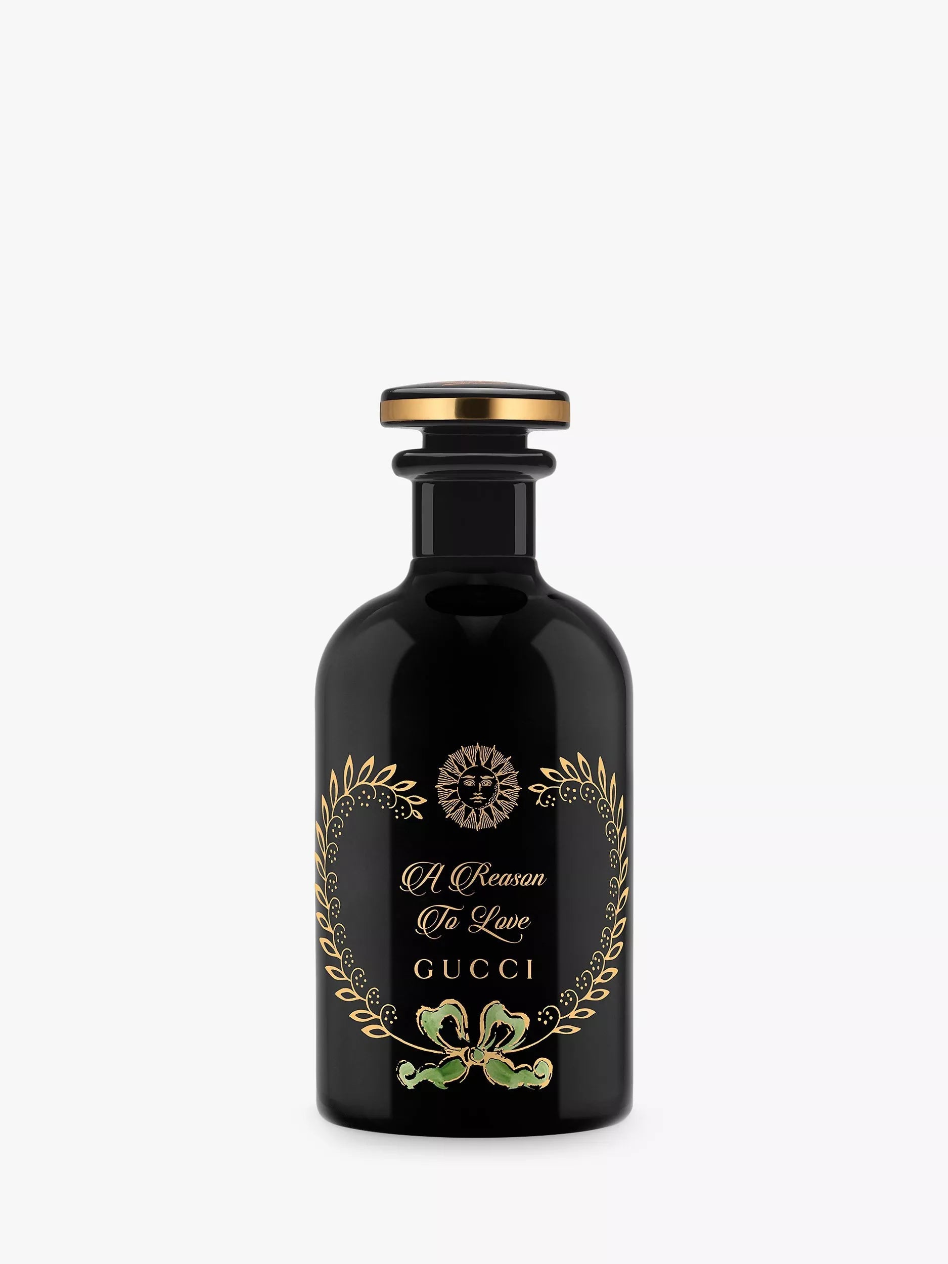 The bottle: The design of each Eau de Parfum bottle is inspired by the bottles found on wooden shelves of a vintage apothecary, curious pharmacy jars and the first perfumery containers. In A Reason to Love Eau de Parfum, the lacquered black design is gilded with a solar totem known as the sun in splendour, sealing the Gucci perfume with a symbol of passion, vitality, and the promise of everlasting fire. Gold lettering, decoration and secret symbols appear on the eaux de parfum, contained in lacquered Gucci fragrance glass bottles with stoppers - covetable objects for lovers of mystery.