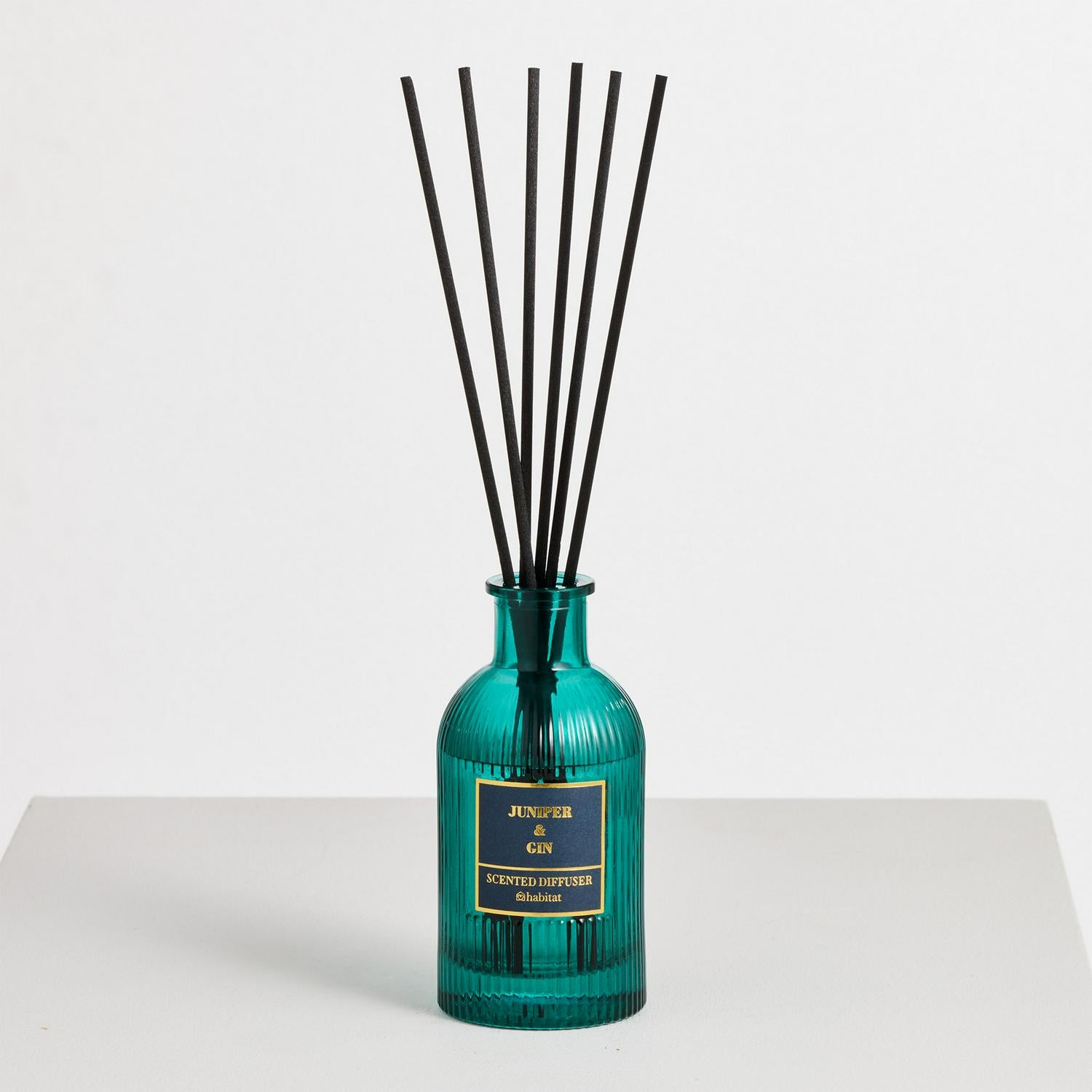 Experience the crisp and clean fragrance of the Habitat Juniper & Gin scented diffuser. This 90ml home fragrance blends sharp citrus notes with classic gin botanicals for a refreshing atmosphere. It is presented in an attractive blue ribbed glass holder complete with rattan reeds.