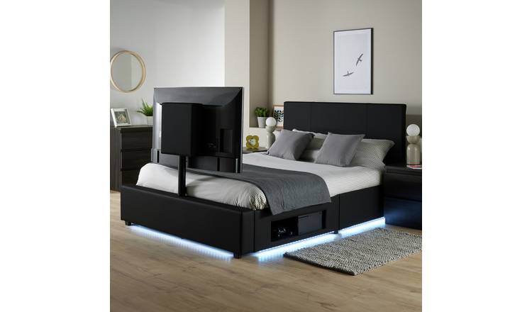 Read MoreThe Ava bed brings you the comfort and practicality of watching TV in bed with its padded upholstered headboard for comfort. The rotating mount means that you can turn the TV (up to 55 in) to suit you so you can watch TV from any angle. The Ava is equipped with a mesh lined media storage unit under the bed, providing ample storage for your devices while keeping them cool. Set the mood with beautiful underbed LED lighting, offering a colourful glow with brightness dimming, white modes and fading effects thanks to the easy-to-use remote control.