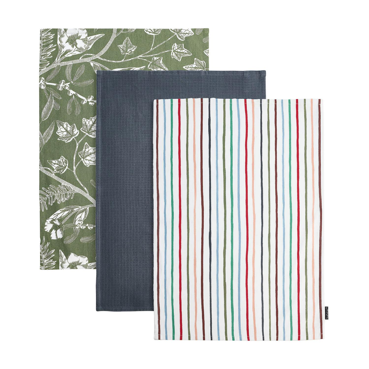 This Habitat set provides three coordinating, absorbent kitchen textiles designed for effective daily use. The cloths feature delicate painterly wildflowers in a soft monochrome green, thoughtfully balanced with varied striped designs and textured weaves. This practical collection adds a refined, graceful touch to everyday kitchen cleanup, ensuring you have appropriate cloths available.